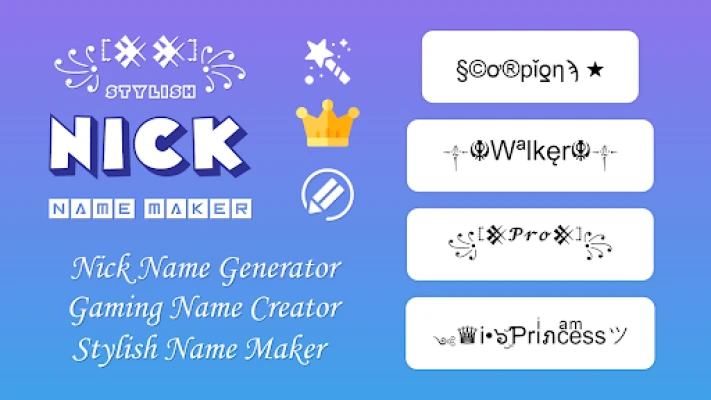 The Nickname Maker App is the perfect place to find just the right name. If you're a gamer who wants a cool nickname or wants to be more creative online, this Stylish Nickname Generator app is easy to use for both. Nickname generator Name style makes the whole process easy, enjoyable, and thrilling. The Create Pro Nicknames feature is made for gamers who want special gaming names.