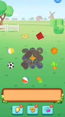 Players need to eliminate 3 identical patterns in the card slots, a total of 7 slots. If failed, they can watch an advertisement to revive or challenge again.When players click on the elements above the game, the elements will move down to the frame at the bottom. A total of 7 cards can be stored in the frame. When there are 3 identical cards, they will be eliminated. For example, three identical buckets can achieve elimination. When there are no cards that can achieve 3 eliminations on the scene, players can observe the cards on the lower layer that are temporarily unavailable. After clicking on the upper card, the card below can be used.